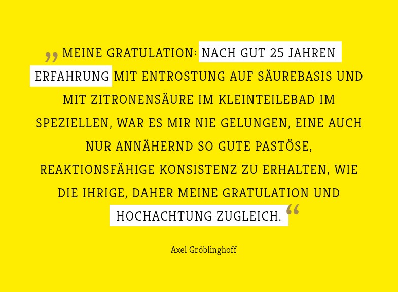 Der einfache und gründliche Rostentferner zur rückstandslosen Entfernung von Rost. Entfernen Sie: Flugrost auf Chrom, Edelstahl und Lack. Ohne Schleifpapier oder Drahtbürste. Für Profis und Heimwerker. Restaurierung von Oldtimern, Youngtimern, PKW's, LKW's, Booten, etc. Für Karosserie- und Maschinenbau im Spritzverfahren einsetzbar. Senkrecht zu verarbeiten durch pastöse Konsistenz.